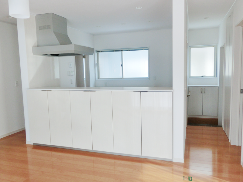 キッチンは家事をしながら、家族を見守る家の「コックピット」です。共働夫婦・子育て・家事の効率化、家族のそれぞれの持ち物を予測しながら、収納計画をし、又、今後の社会的状況変化に対応できるようにLED照明・太陽光発電(4.2kw)年間売電実績160,188円や車のEV化にも対応できるように充電器も附帯しました。